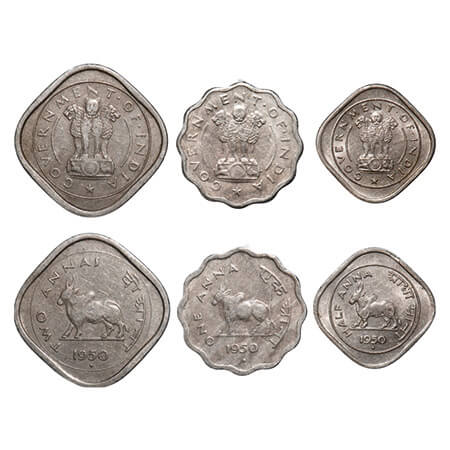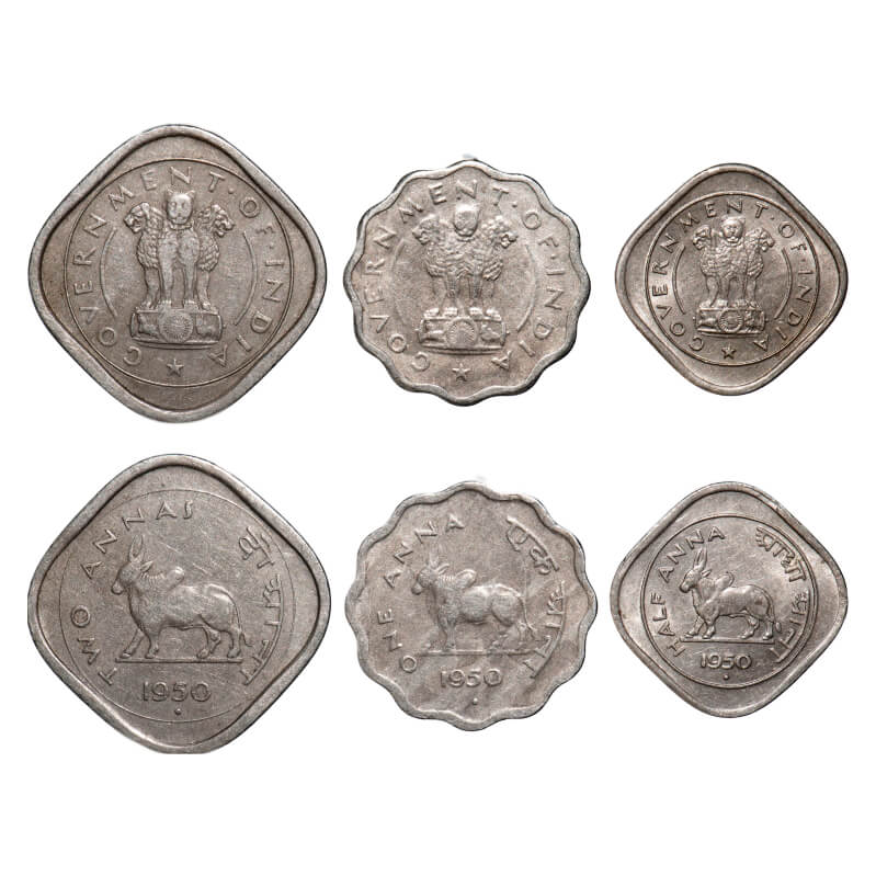 2, 1, 1/2 Annas (3 Coins), 1950, Cu-Ni. Bombay Mint. Very Fine to Uncirculated. Scarce.