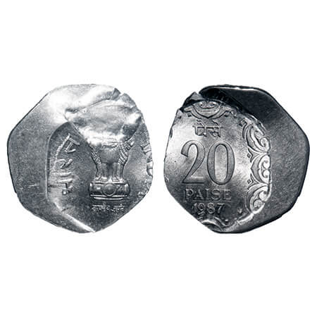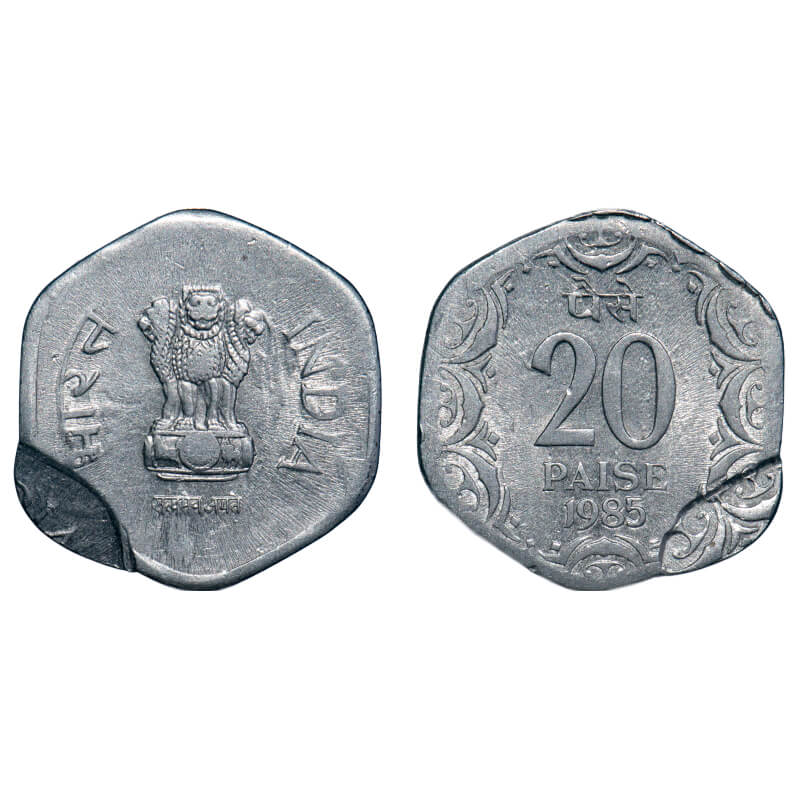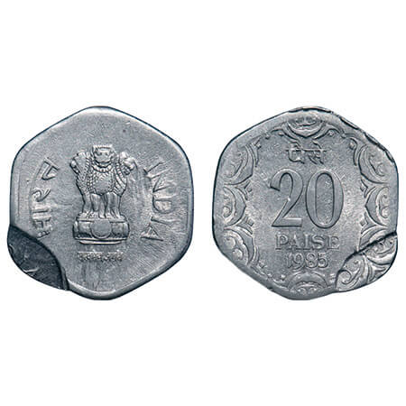 20 Paisa, 1985, Aluminium, 2.18g, Calcutta Mint, Indent error & double struck on both sides. Extremely Fine, Scarce.