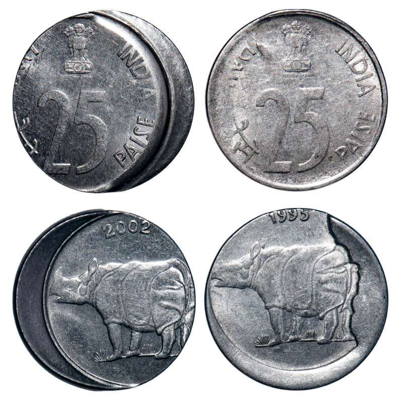 25 Paisa, 1995 & 2002 (2 Coins), FSS, 2.86 & 2.87g, Cud error and other misalligned die cap. Very Fine+, Scarce.