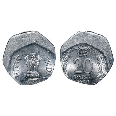 20 Paisa, 1986, Aluminium, 2.20g, 30% misaligned die. Uncirculated, Scarce.