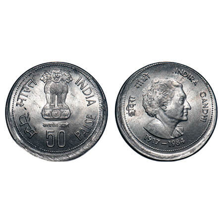 50 Paisa, 1984, Cu-Ni, 4.86g, Calcutta Mint, Indira Gandhi, Indent Error on obverse, About Uncirculated, Scarce.