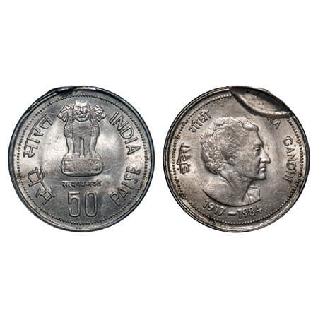 50 Paisa, 1984, Cu-Ni, 4.96g, Calcutta Mint, Indira Gandhi, Die shift Error, Uncirculated, Scarce.
