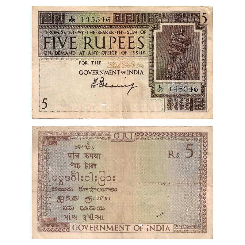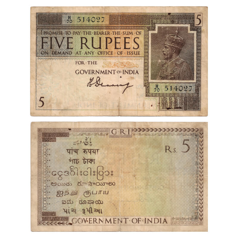 British India, George V, 5 Rupees, (1925), Signed by H. Denning, Black Serial No H 70 514027, Watermark A. Folds, stains, 2 holes. J&R 3.4.1A. About Very Fine, Scarce.