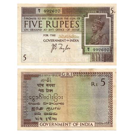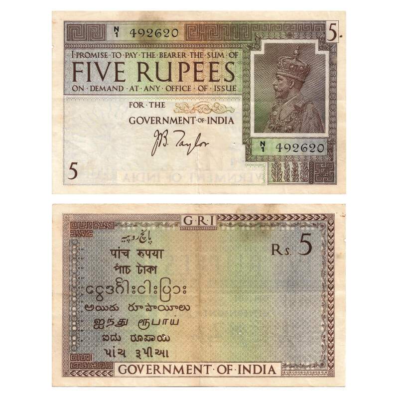 British India, George V, 5 Rupees, (1925), Signed by J. B. Taylor, Black Serial No N 1 492620, Watermark B. 2 Holes, Folds, stains. J&R 3.4.2. Very Fine+, Scarce.