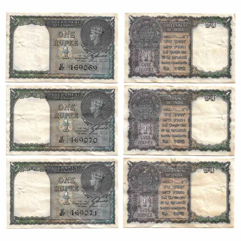 British India, George VI, 1 Rupee, (1940) (3 notes consequtive serial numbers). Signed by C. E. Jones, Black Serial No U 87 469069-70-71. Facing head left, fold. J&R 4.1.1A. Thread holes, Extremely Fine+, Scarce.