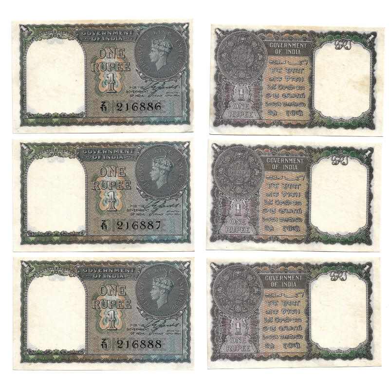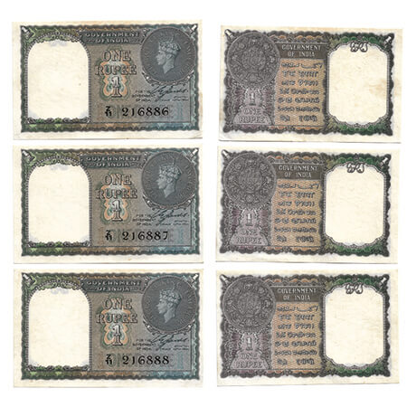 British India, George VI, 1 Rupee, (1940) (3 notes consequtive serial numbers). Signed by C. E. Jones, Black Serial No Z 11 216886-87-88. Facing head left, fold. J&R 4.1.1A. without pin holes, Uncirculated, Scarce.