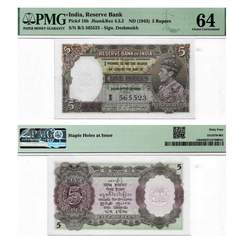 British India, George VI, 5 Rupees, (1943-1944 AD issue) Signed by C.D Deshmukh, Serial No R 5 565523. Portrait Profile head facing right watermark. J&R 4.3.2. PMG graded 64 EPQ Choice Uncirculated, Scarce.