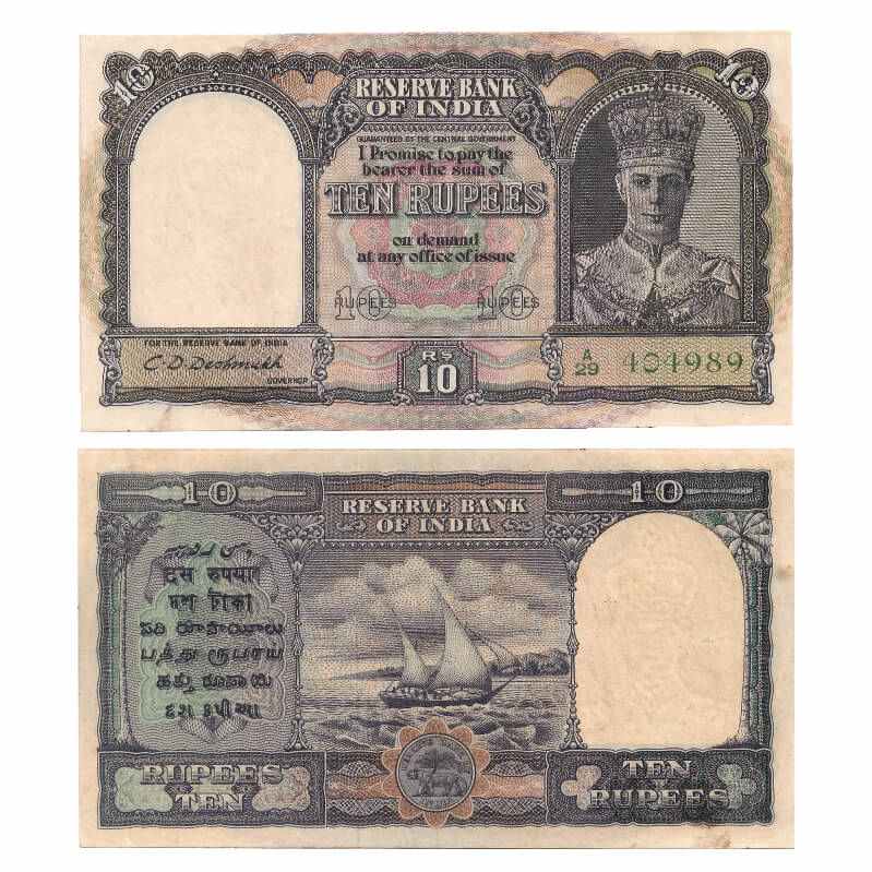 British India, George VI, 10 Rupees, (1944). Signed by C.D Deshmukh, Green Serial No A 29 404989. Front facing portrait watermark. J&R 4.6.1. normal pin holes, stains, Uncirculated, Scarce.