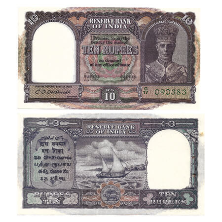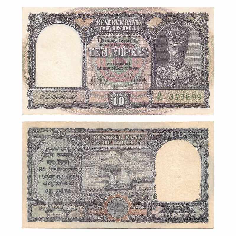 British India, George VI, 10 Rupees, (1944). Signed by C.D Deshmukh, Green Serial No D 92 377699. Front facing portrait watermark. J&R 4.6.1. normal pin & thread holes, stains, Almost Uncirculated, Scarce.