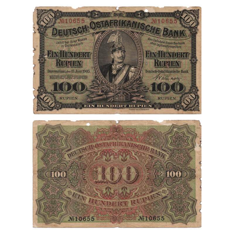 German East Africa, 100 Rupien, Deutsch-Ostafrikanische Bank, 1905 Issue, Serial No 10655. Portrait Kaiser Wilhelm II in cavalry uniform at center. mulitiple holes, folds, stains. About Very Fine, Scarce.