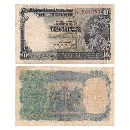 British India, George V, 10 Rupees, (1935). Signed by J.W.Kelly, Serial No Q 24 864657, pin & thread hole holes, folds. J&R 3.8.2. About Very Fine+, Scarce.