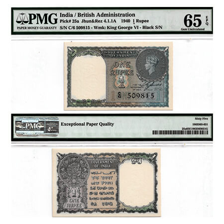 British India, George VI, 1 Rupee, (1940). Signed by C. E. Jones, Black Serial No C 6 509815. Facing head left. J&R 4.1.1A. without pin holes, PMG graded 65 EPQ Gem Uncirculated, Scarce.
