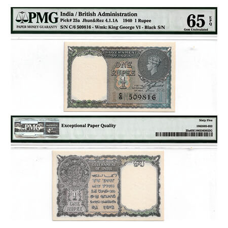 British India, George VI, 1 Rupee, (1940). Signed by C. E. Jones, Black Serial No C 6 509815. Facing head left. J&R 4.1.1A. without pin holes, PMG graded 65 EPQ Gem Uncirculated, Scarce.