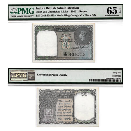 British India, George VI, 1 Rupee, (1940). Signed by C. E. Jones, Black Serial No G 48 454515. Facing head left. J&R 4.1.1A. without pin holes, PMG graded 65 EPQ Gem Uncirculated, Scarce.
