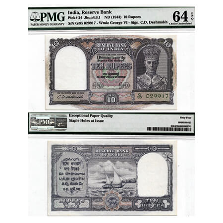British India, George VI, 10 Rupees, (1944). Signed by C.D Deshmukh, Green Serial No G 95 029917. Front facing portrait watermark. J&R 4.6.1. PMG graded 64 EPQ Choice Uncirculated, Scarce.
