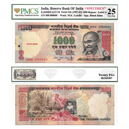 Republic India, 1000 Rupees, SPECIMEN (1997-2003), Gandhi series, Signed by Bimal Jalan, Inset A, Serial No 000 000000. J&R 6.9.5.1B. PMCS graded 25 Very Fine, Rare.