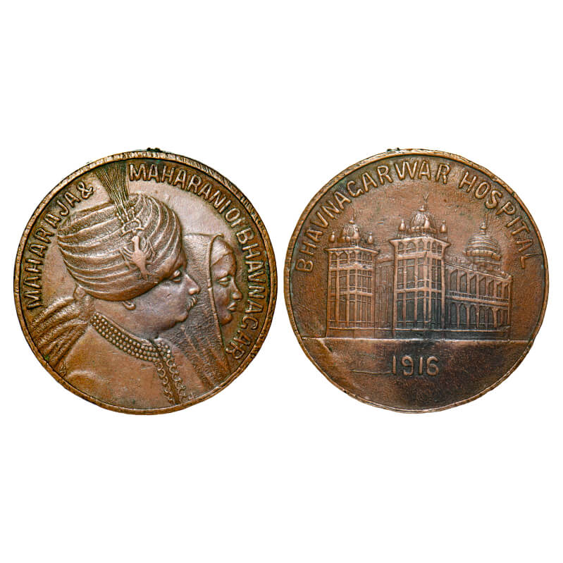 Bhavnagar State, Bhavsinhji II War Hospital Medal, Copper, 30.69g, 1916, Obv: Conjoined bust of Maharaja Bhavsinhji II and Maharani facing right, English legend “MAHARAJA & MAHARANI OF NHAVNAGAR” around border, Rev: Depiction of the Bhavnagar War Hospital, English legend “BHAVNAGAR WAR HOSPITAL” around upper border, date 1916 below, awarded to 1412 Sepoy Husain Khan 125 Rifles (Pudd# 916.3). About Extremely Fine, Rare.