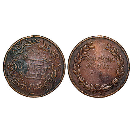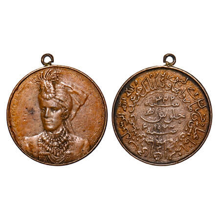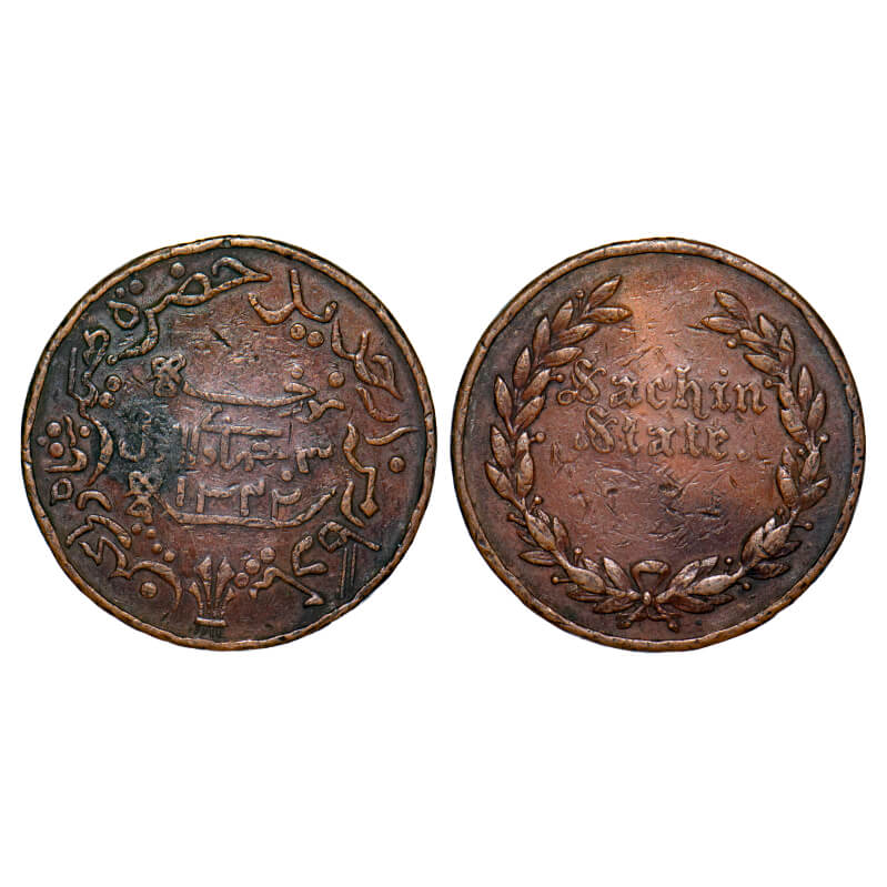 Sachin State, Copper Medal, 16.26g, 32mm, AH 1342, Obv: sachin state in wreath, Rev: ba yadgar min az jadid hazrata sinshah vali bachin around, morcha 3 jihad-ul-awwal & sana hijri in centre, About Very Fine, Rare.