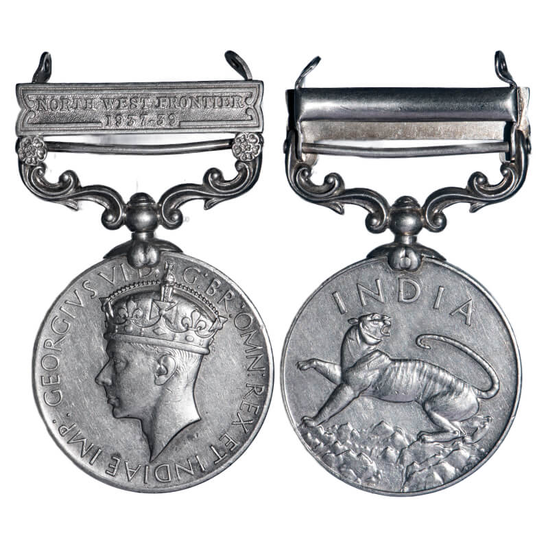 George VI, India General Service Medal, Silver, 41.77g, North West Frontier 1937-39 bar, Rev: an Indian tiger with India written at top awarded to 2241 Ren Bale Thapa, 1-8 G.R. (MYB 164). Extremely Fine+, Scarce.