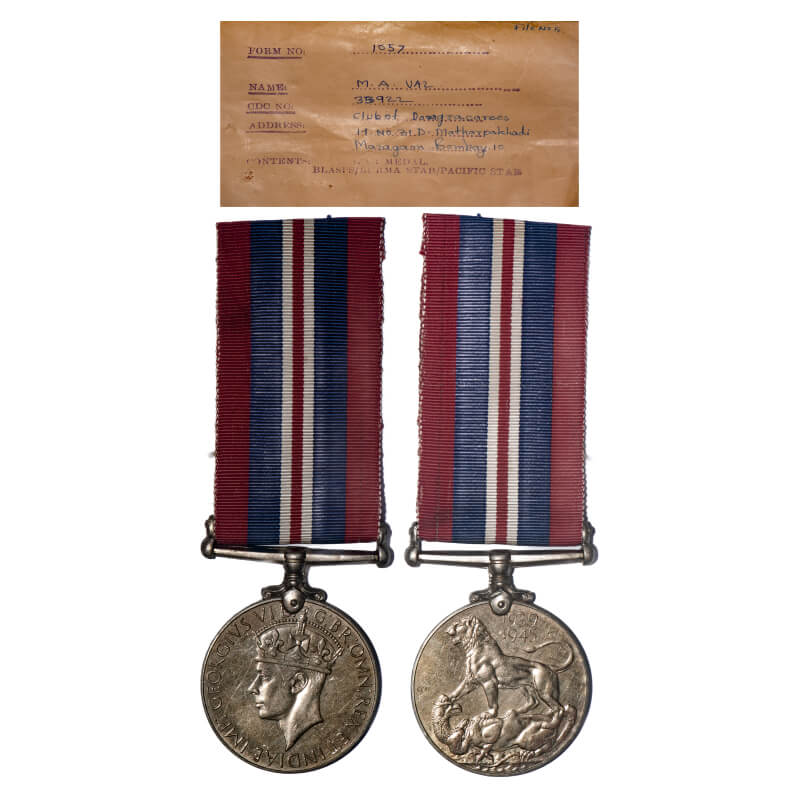 George VI, Nickel Medal, World War II, 1939-1945, awarded to 35922 M. A. Vaz. MEP SEA MEN, with ribbon with original paper cover stamped and hand written and description of the awardee. Extremely Fine. Scarce.