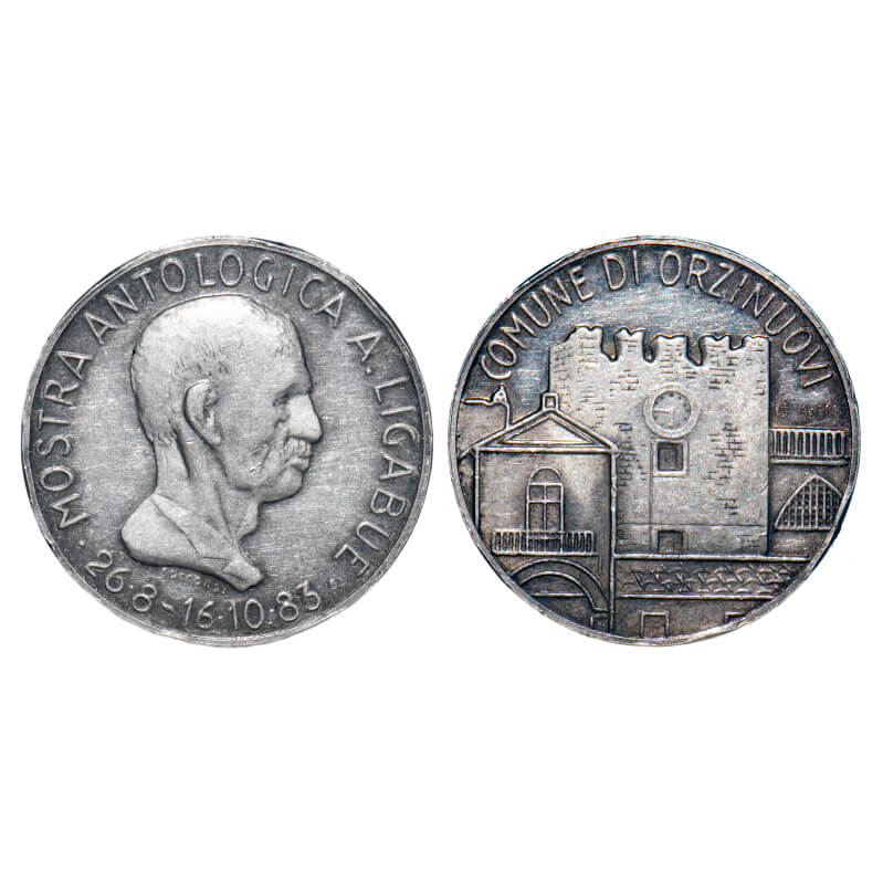 Italy, Silver, (0.9860 % Silver), 12.00g, Municipality of Orzinuovi Ligabue Exhibition 1983 (Medal) Pure silver hallmarked, Obv : mostra anthologica A.ligabue 26.8 - 16.10.83 Rev: comune di orzinuovi, (view of the tower of the castle of San Giorgio in Orzinuovi ). Toned Uncirculated, Scarce.