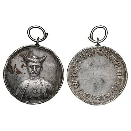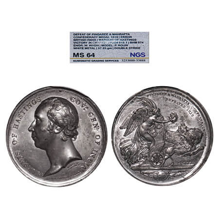 Maratha War Medal, White Metal, 37.25g, Defeat of Pindaree & Mahratta Confederacy Medal 1818, Error, British India, Marquis of Hastings Victory in chariot, Pud # 818.1, Bhm 974 Engr : W. Wyon, Model : P. rouw, Double Strike NGS graded MS 64, Very Rare.