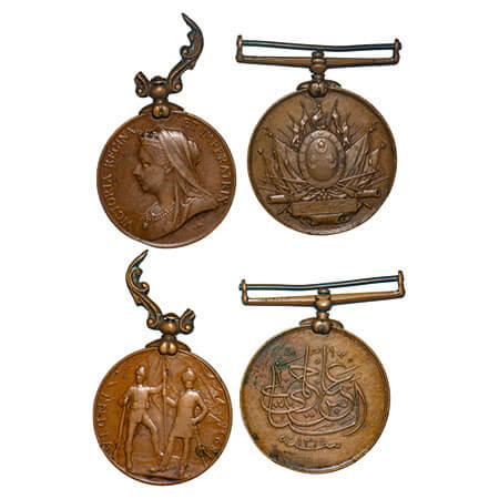 Victoria Queen & Sudan Medal (2 Medals), Bronze issues, 1)British Empire campaign medals, Khedive’s Sudan Medal 1896 - 1908 The medal is circular, 39mm in diameter and struck in bronze. The obverse of this medal contains the Arabic inscription; 'ABBAS HILMI THE SECOND' and the date; '1314'.The reverse contains the Arabic inscription; 'THE RECONQUEST OF THE SUDAN 1314', supporting a trophy of arms.Over this is a centrally positioned oval shield decorated with stars and crescents - in the background is a display of lances and flags. The ribbon suspender is of the plain, straight and swivelling style, ( Sweeper Famma ? Singh 35th Sikh infy ) in running cursive writing First letter in name bruises , 'Singh' later crossed, 2) India Medal Victoria, Portrait bust of Victoria. Rev: British and Indian soldiers supporting a stand. India 1895 around , broken suspender, ( Sweeper Famma ? 35th Sikhs ) in running cursive writing"About Extremely Fine, Scarce.