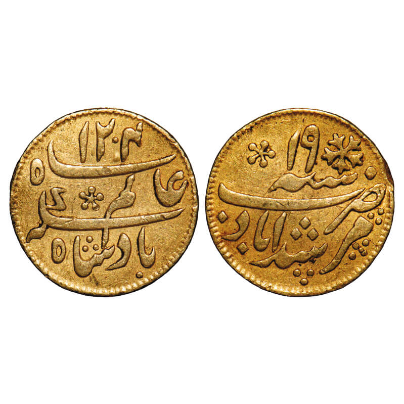 Bengal Presidency, Gold 1/4 Mohur, 3.09g, (1793-1818 AD Issue), Murshidabad (Calcutta) Mint, INO Shah Alam II, AH 1204 / 19 RY. P.Stevens (Page 40) 4.7/F. Prid 64. Very Fine, Scarce.