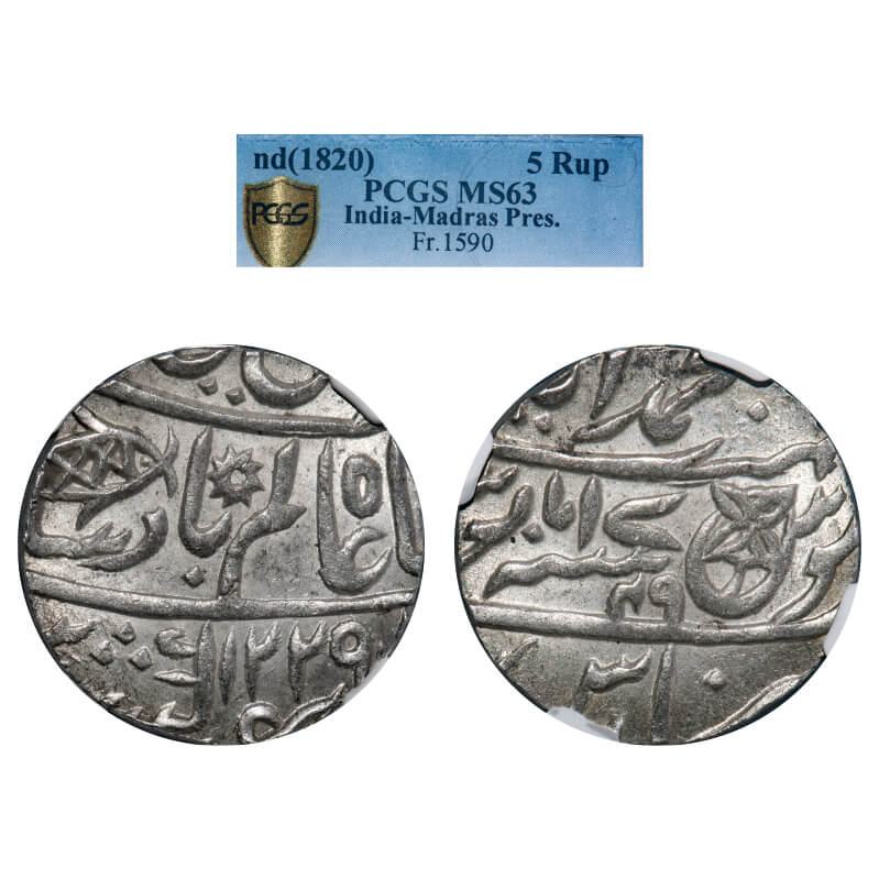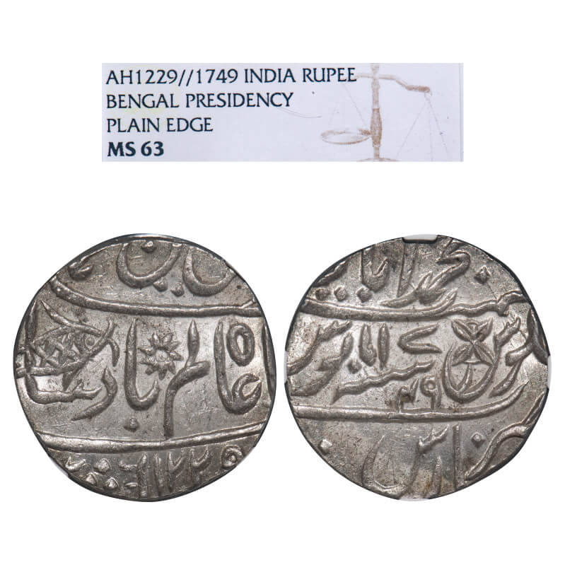 Bengal Presidency, Silver Rupee, (1776-1812 AD Issue), Muhammadabad Banaras Mint, AH 1225/17-49, INO Shah Alam II, broad flan. P.Stevens (Page 104) 7.105/Prid 279. NGS graded MS 63, Scarce.