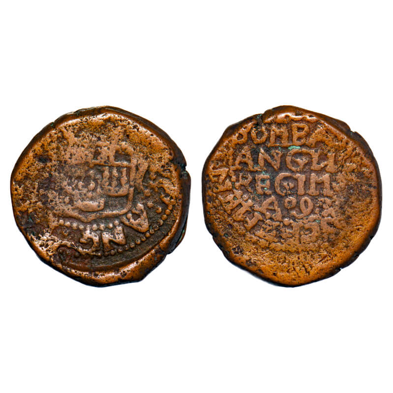 Bombay Presidency, Copper Pice (Copperoon), 13.80g, (1674), Obv: (HON : SOC : ANG : IND : ORI ) Coat of Arms, Rev: MON BOMBAY ANGLIC REGIMS A dot 0 9 dot 0. P.Stevens (Page 203) unlisted type / F. Prid 81 Type. Fine+, Scarce.