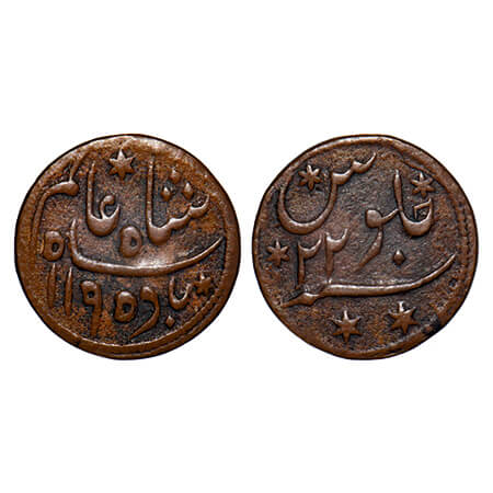 Bengal Presidency, Copper 1/16 (Pao Falus), 1.95g, 14.5mm, (1780-1784 AD Issue), Princep's Coinage, Pulta Mint, in the name of Shah Alam II, AH 1195 / RY 22, Machine struck issue. P.Stevens (Page 36) 3.28/F. Prid 201. Extremely Fine, Rare.