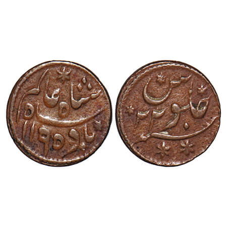 Bengal Presidency, Copper 1/16 (Pao Falus), 1.95g, 14.5mm, (1780-1784 AD Issue), Princep's Coinage, Pulta Mint, in the name of Shah Alam II, AH 1195 / RY 22, Machine struck issue. P.Stevens (Page 36) 3.28/F. Prid 201. Extremely Fine, Rare.