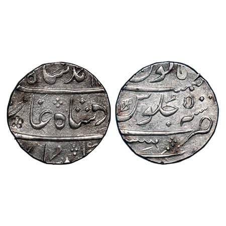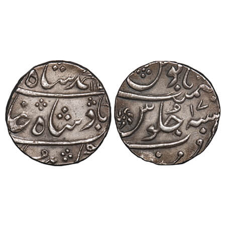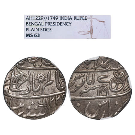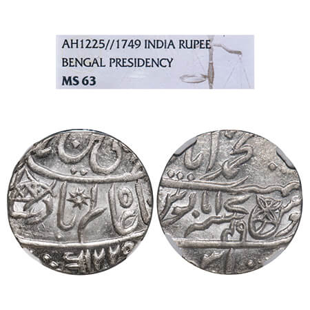 Bengal Presidency, Silver Rupee, (1776-1812 AD Issue), Muhammadabad Banaras Mint, AH 1225/17-49, in the name of Shah Alam II, broad flan. P.Stevens (Page 104) 7.105 type / Prid 279. NGS graded MS 63, Scarce.