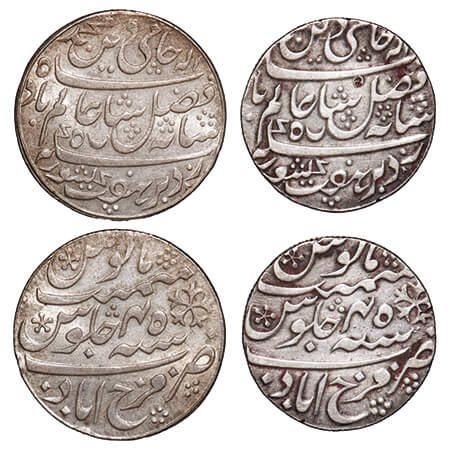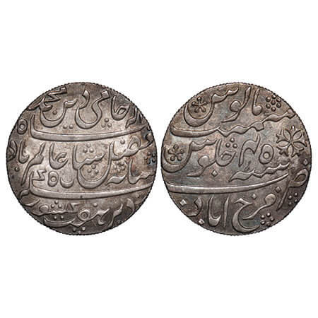 Bengal Presidency, Silver Rupee (2 Coins), 1) 11.20g, (1817 & 1819 AD Issue), Farrukhabad (calcutta) Mint, 45 RY, INO Shah Alam II, Grained right on edge. P.Stevens (page 93) 6.21 type/F.Prid 317. toned Uncirculated, Scarce. 2) Bengal Presidency, Silver Rupee, (1820-1831 AD Issue), Farrukhabad Mint (Calcutta), INO Shah Alam II, 45 RY, Vertical Milling on edge. P.Stevens (Page 112) 7.149 / F. Prid 323. Very Fine, Scarce.