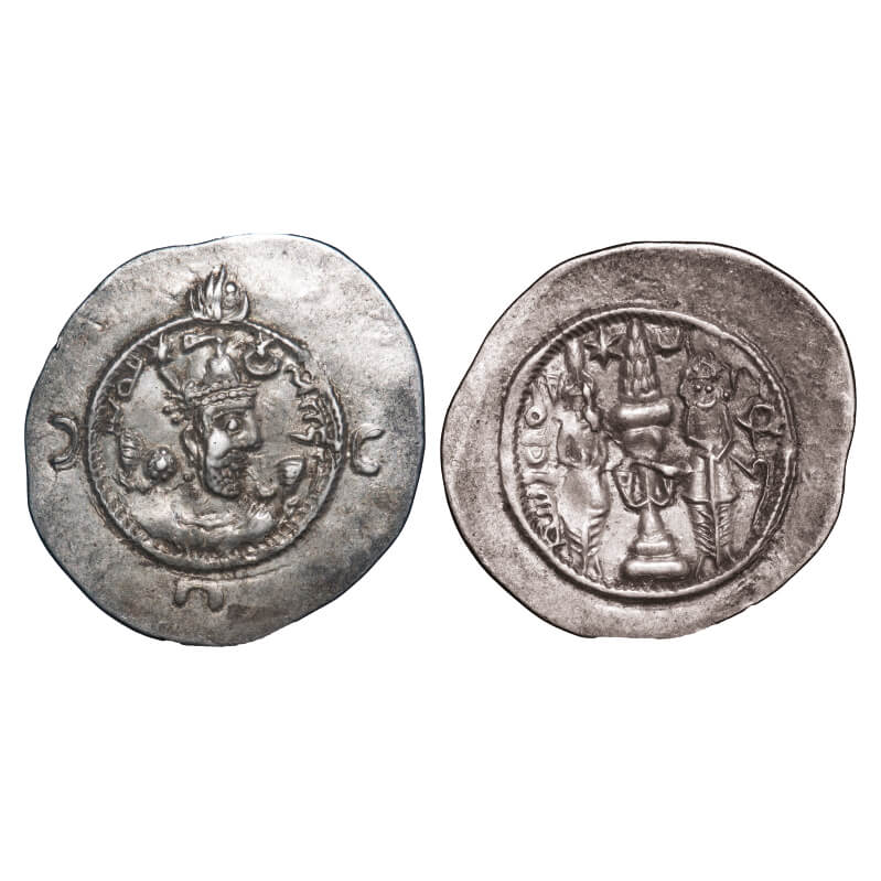 Sassanian Empire (c.300-500 AD), Silver Drachm, 4.01gm, 31.87x32.25mm, Obv: Crowned and diademed bust of king to right, Pahalvi legend, Dotted border around, Stars and Crescents outside dotted border, Rev: Zoroastrian Fire Altar at center, flanked by attendants on either side, Sun and Moon above, Dotted border around. Very Fine+, Scarce.