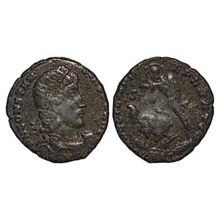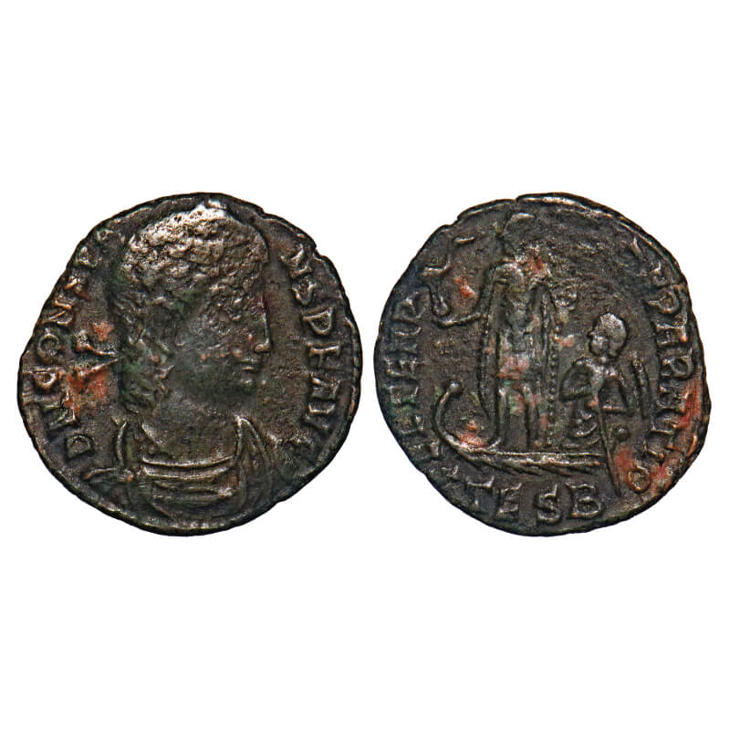 Roman Imperial, Constans, Centenionalis 348-350 AD, (AE)Copper-Bronze, 2.18gm, 17.63x17.88mm, Obv: 'D N CONSTANS P F AVG' Constans bust to right, pearl diademed, draped and cuirassed bust, Rev: 'FEL TEMP REPARATIO', Emperor on galley sailing to left, holding phoenix on globe and labarum, Victory seated steering at helm, TESB in exergue. About Very Fine, Scarce.