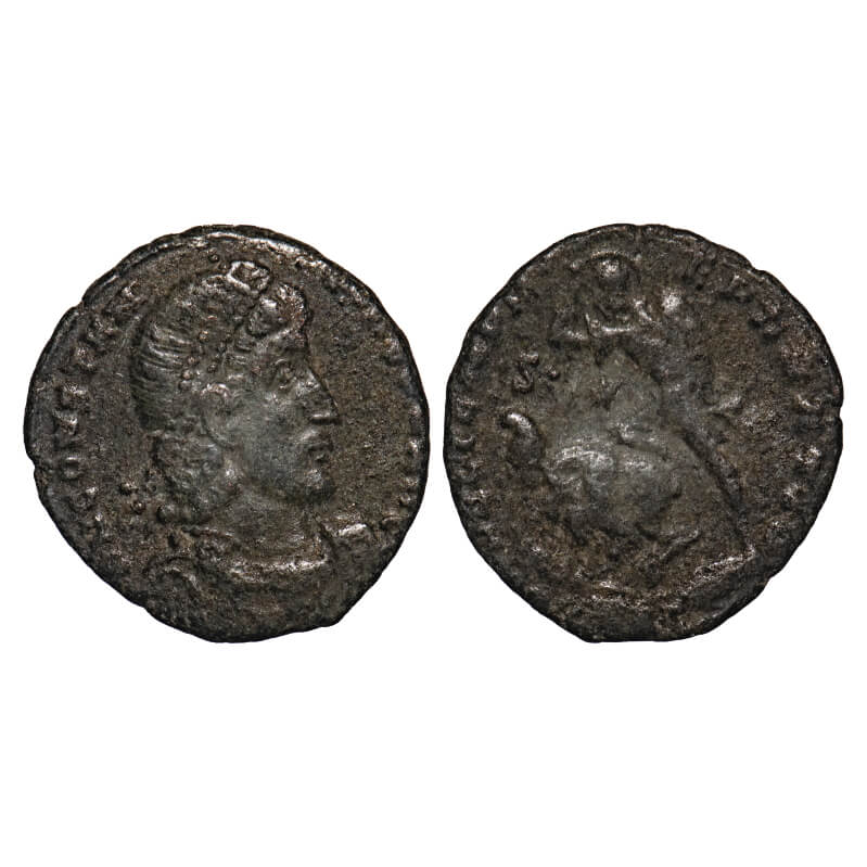 Ancient Roman, Constantius II, (337 - 361 AD) Second eldest son of Constantine, (AE)Bronze, 3.66gm, 20.26x19.11mm, Minted in Heraclea (Marmara Ereglisi, Turky), Obv: (D N CONSTAN-TIVS P F AVG) Bust of Constantius II to right, Rev: 'FEL TEMP REPARATIO' (Latin: Happy times restored), Roman soldier spearing falling enemy horseman, Mintmark SMH Epsilon. Heraclea RIC VIII 90. (In 352, The Alamanni and the Franks defeated the Roman army and took control of 40 towns between the Moselle and the Rhine. The return of happy times, advertised by the reverse legend, was more a hope than reality.) About Very Fine, Scarce.