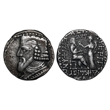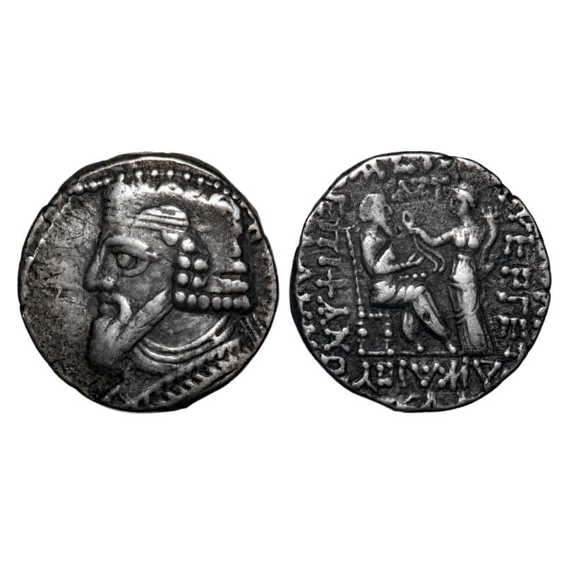 Parthian Empire, Gotarzes II, AD 44-51, Silver Tetradrachm, Seleucia Mint (Amajor city in the Parthian Empire), 14.36gm, 37.04x26.77mm, Obv: Bare headed bust of Gotarzes II Left with long beard, boarder of dots, Rev: King Gotarzes II seated right on the throne receiving diadem from the godess Tyche, who is holding a cornucopia, Greek inscriptions around the figures, including ' King of Kings'. Toned Very Fine, Rare.