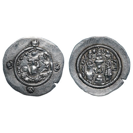 Sassanian Empire (c.300-500 AD), Silver Drachm, 4.01gm, 31.87x32.25mm, Obv: Crowned and diademed bust of king to right, Pahalvi legend, Dotted border around, Stars and Crescents outside dotted border, Rev: Zoroastrian Fire Altar at center, flanked by attendants on either side, Sun and Moon above, Dotted border around. Very Fine+, Scarce.