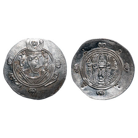 Arab-Sasanian. al-Muhallab b (AH 75-79 / 694-698 AD) Pre-reform issues, Silver ½ Drachm, 2.01gm, 22.74x23.56mm, Abi Sufra, Obv: Crowned bust of king facing to right side, front of Pahlavi legend, Rev: Fire altar with two attendents. Uncirculated, Very Scarce.