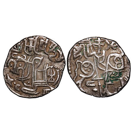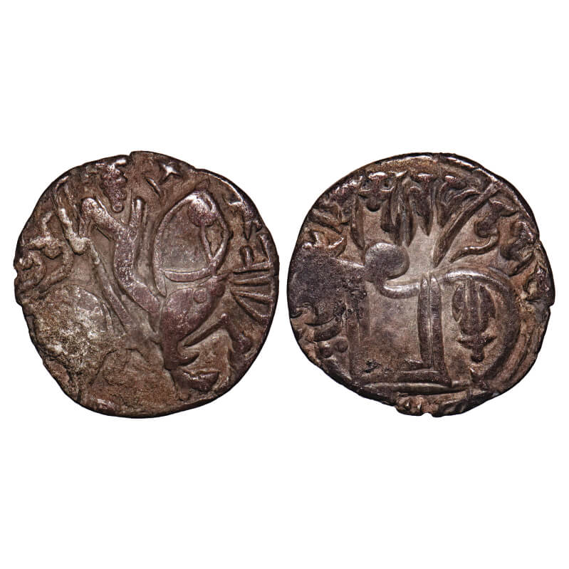 Chauhans of Ranthambore Jaitrasimha, (c. 1300 AD), Silver, 4.14gm, 12.59x13.66mm, Obv: Lion to left with front paw raised. Double dotted circle around, Rev: Legend reads in Nagari script in three lines ‘Jaitasi Deva’. Deyell # 366. Toned Very Fine, Scarce.