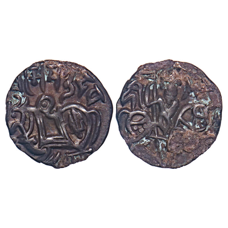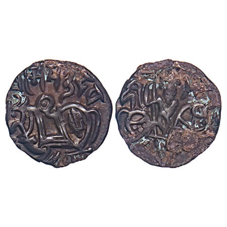 Hindu king of Kashmir, Sussala deva (c 1100-1110 AD), Copper Drachm, 5.80gm, 18.57x19.06mm, Obv: Stylized kushan style godess seated facing, sharda legend su/ssala on either side, Rev: stylized kushan style, standing king making an offering at a sacrificing sharda legend deva under the arm. About Very Fine, Scarce.