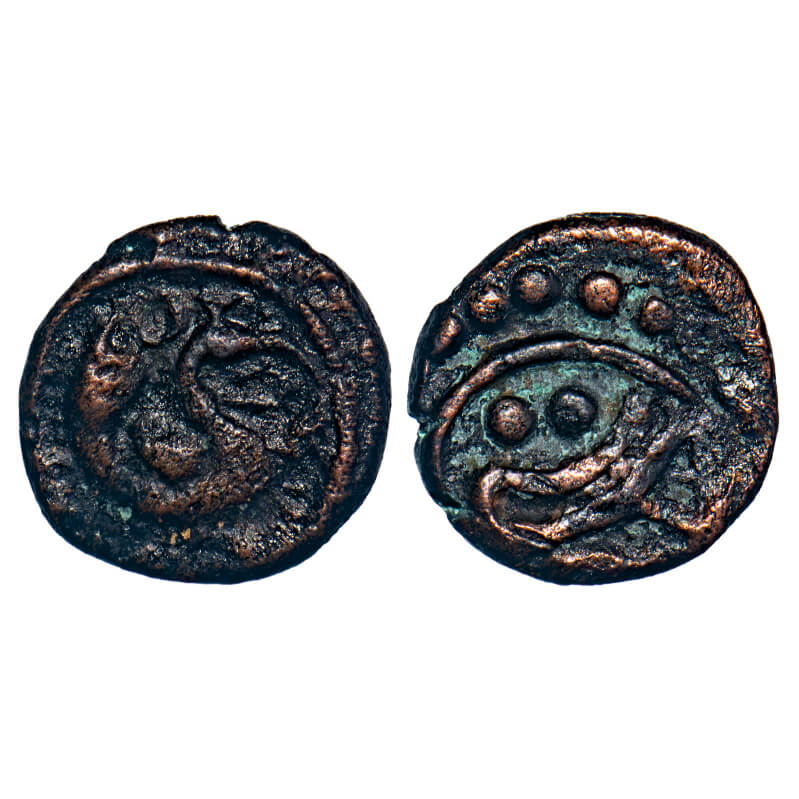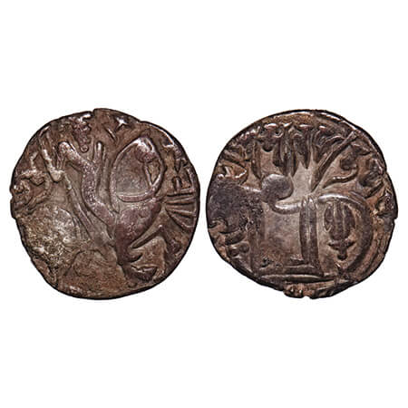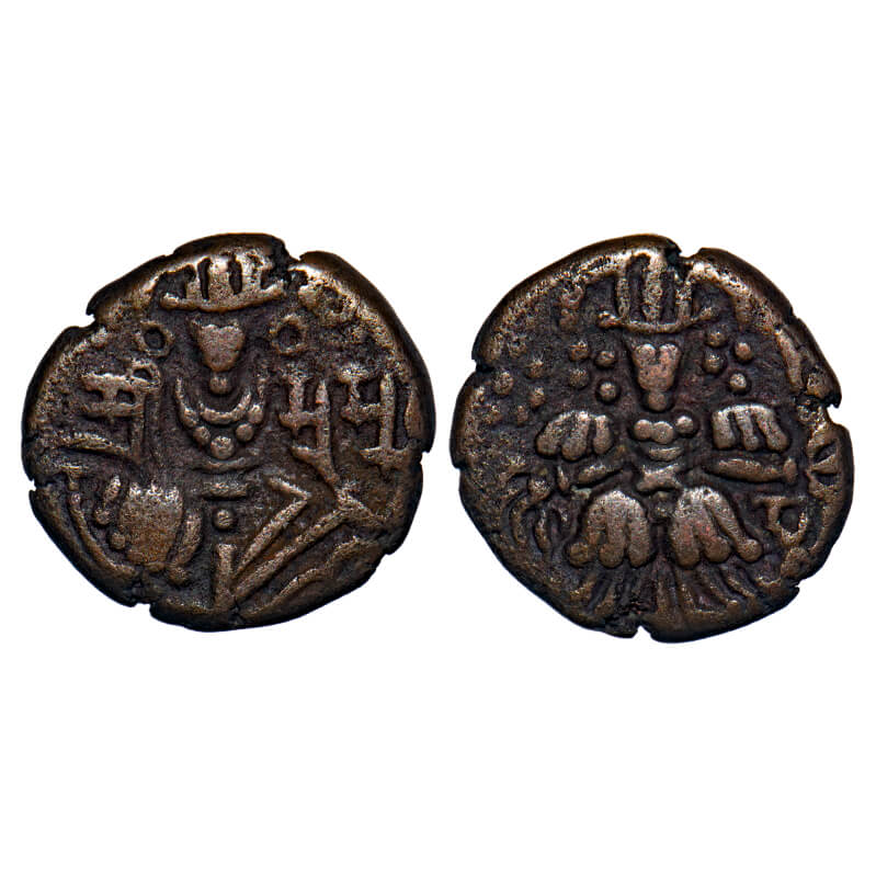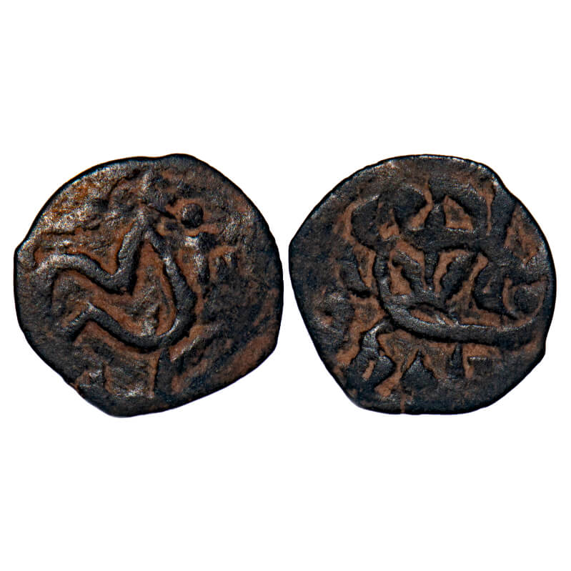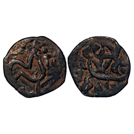 Shahis of Ohind, Samantdeva (850-1050AD), Copper Unit, 0.59gm, 12.54x13.13mm, Obv: Elephant walking to left, Sharada legend Shri ‘Samantdeva’ above, Rev: Roaring lion raising his forepaw facing right. R Tye # 19. Very Fine, Scarce.