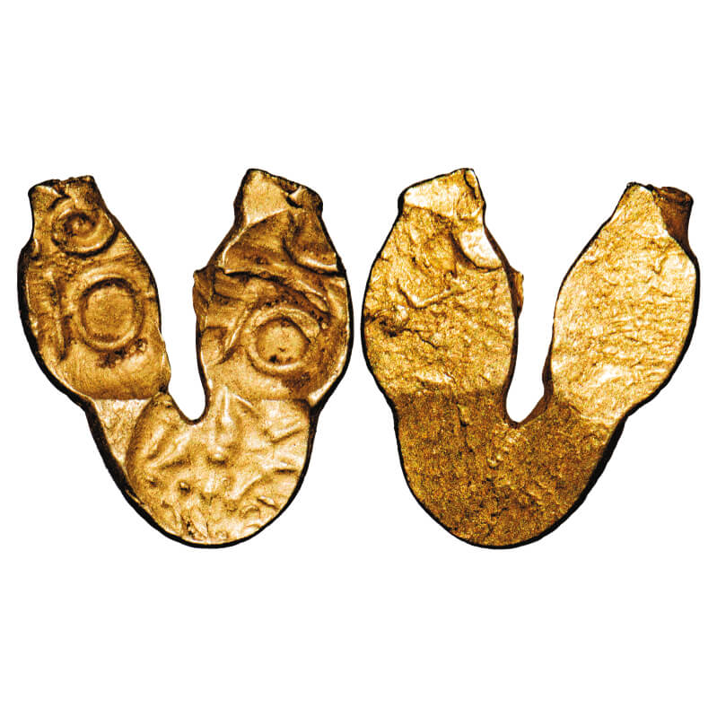 Shilaharas of Kolhapur or Feudatories (c. 1050-1212 AD), Gold U-Shaped Fanam, 0.57gm, 9.94x8.63 mm, three punches, two with Kannada Shri and the third of a Garuda running to right, Uniface Mitch # K&A 249. Uncirculated, Rare.