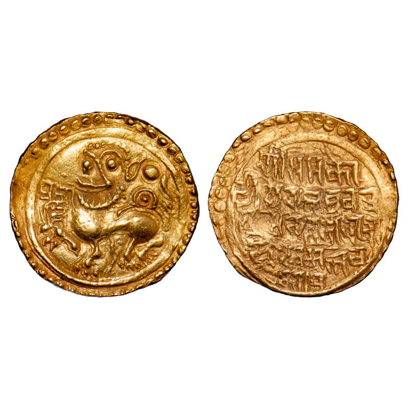 Kadambas of Goa, Jayakesin III (c. 1186 -1213 AD), Gold Gadyana, 4.41gm, 20.71x21.26mm, Obv: Lion standing facing left with a raised forepaw, sun and moon above the rump, swastika symbol front of lion and name of cyclic year Prajapati in front, Rev: Devanagari legend ‘Shri saptako/tisa labdhavaravi/ra jayakesi/deva Malava/ramari’ in five lines. K. Ganesh # 6.9 type. About Extremely Fine, Rare.