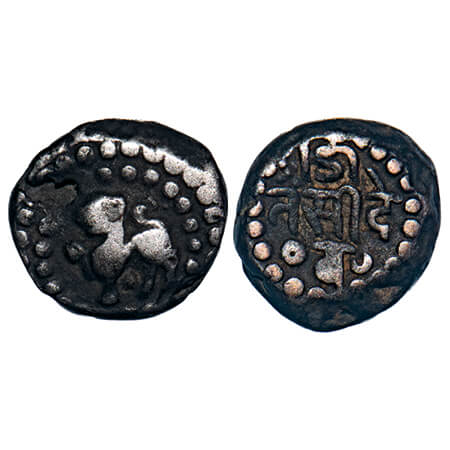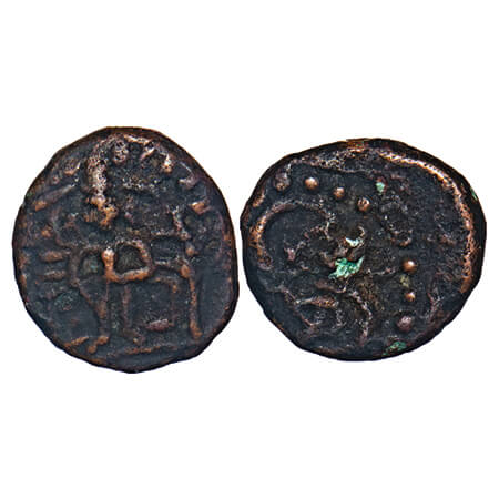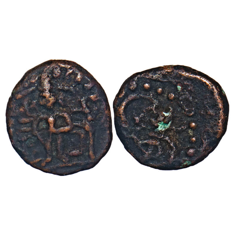 Chudasama dynasty of Gujarat, (12-13c AD), Copper Unit, 2.67gm, 13.81x14.19mm, Obv: Elephant walking to left side, Rev: Nagari letter ‘Shri’ within dotted circle. About Very Fine, Scarce.