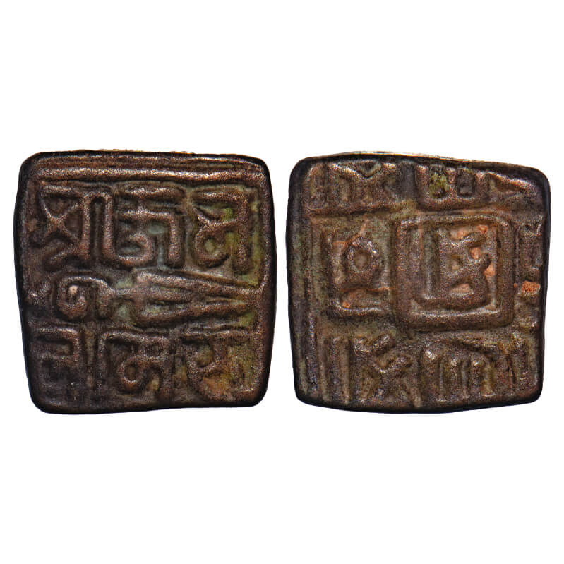 Ranas of Mewar, Maharana Kumbhakarna (1433-1468 AD), Copper ½ Paisa, 6.28gm, 15.76x15.74 mm, Nagari legend on both sides citing Rana Kumbhakarna and Eklingaji (Shiva), obv. Shri within a square with ‘Ekalingasya Prasadata’, Rev: Nagari legend 'Shri Kumbhala/Meru' with horizontal katar / dagger. Unpublished. Very Fine, Rare.