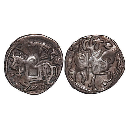 Hindu Shahis of Kabul and Ohinda, Samantadeva (c. 850-1,000 AD), Silver Jital, 3.13g, 17.60x17.46mm, Obv: Recumbent bull facing left with Sarada legend ’Sri Samantadeva', Rev: Rider on a caparisoned horse with legend 'Ha' next to the rider. Toned. Very Fine, Scarce.