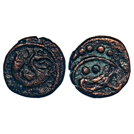 Chudasama dynasty of Gujarat, (12-13c AD), Copper Unit, 2.60gm, 13.07x13.04mm, Obv: Peacock standing facing to right side within circle, Rev: Animal figure within circle and outer dotted border. Unpublished. Very Fine, Scarce.