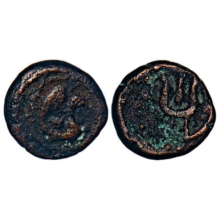 Medieval Gujarat region, 'Gandharva' type, inscribed Copper coin (c. 600 - 700 AD) probably issued by a local ruler of unascertained dynasty, 0.69 gm, 9.43x10.62 mm, Obv: Divine figure of a Gandharva flying to right, Rev: A trident in centre with uncertain legend around. Fine for the type, Uncleaned wirh natural patina. Rare. About Very Fine, Scarce.